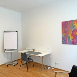 Meine Praxis ☸ Selbst-Stärkung bietet eine ruhige, Vertrauen stiftende Umgebung für Ihre Anliegen und Themen. Der 18 m² große Raum ist mit modernem und hochwertigem Interieur ausgestattet. Moderationsmaterial wie z. B. Flipchart, Pinnwand, Systembrett und technische Vollausstattung für Videoanalyse mit HD-Camcorder stehen für Sie zur Verfügung.